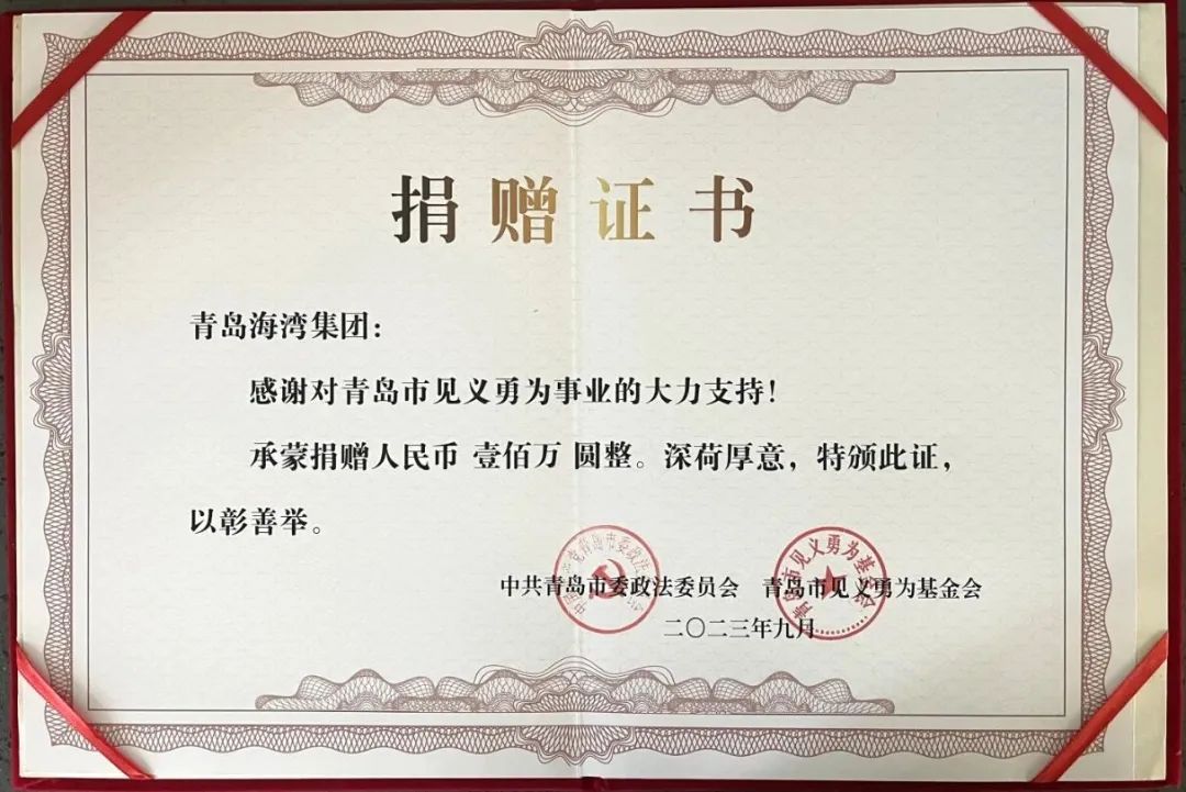 會上,通報全市見義勇為工作有關(guān)情況,對捐贈100萬元的理事單位實施表彰,并頒發(fā)青島市見義勇為工作杰出貢獻單位獎牌及捐贈證書,海灣集團光榮入圍。