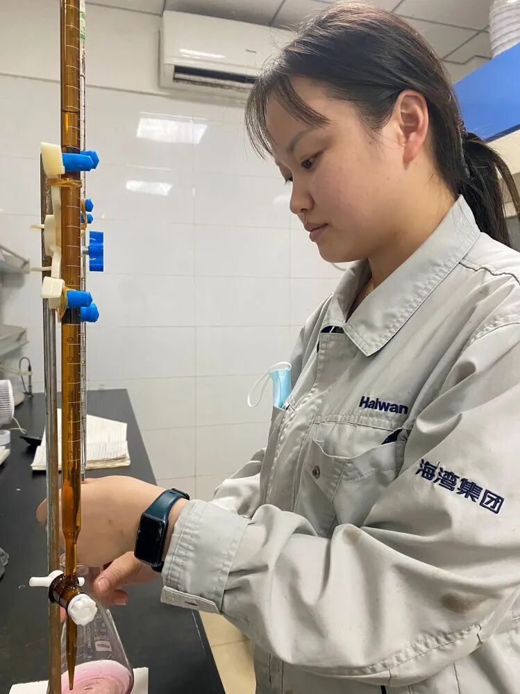 推開化驗(yàn)室的門,明亮的燈光下,王甜正俯身操作臺(tái),在專注地測定樣品中的游離酸與氯離子含量。只見她左手穩(wěn)穩(wěn)扶住滴定管,右手輕晃錐形瓶,瓶內(nèi)溶液的顏色變化被她緊緊鎖在視線里——一滴、兩滴,每一次滴加都精準(zhǔn)控制,每一個(gè)動(dòng)作都沉穩(wěn)有序。她心里清楚,這重復(fù)的操作不是機(jī)械流程,而是產(chǎn)品合格的“第一道防線”,更是平穩(wěn)生產(chǎn)的關(guān)鍵。