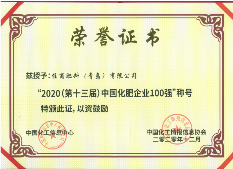 堿業(yè)發(fā)展住商肥料獲“2020中國(guó)肥料企業(yè)100強(qiáng)”稱(chēng)號(hào)