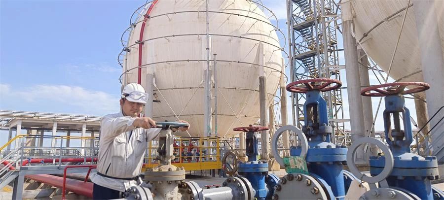 晨曦微露,海灣港務(wù)LPG球罐在朝陽下成為“發(fā)光體”,散發(fā)著金屬光澤,縱橫交錯的管道如同精密的血脈。身著防靜電工裝的罐區(qū)員工張興正在檢查置換工藝,目光專注,不放過每一個接口、每一處閥門。