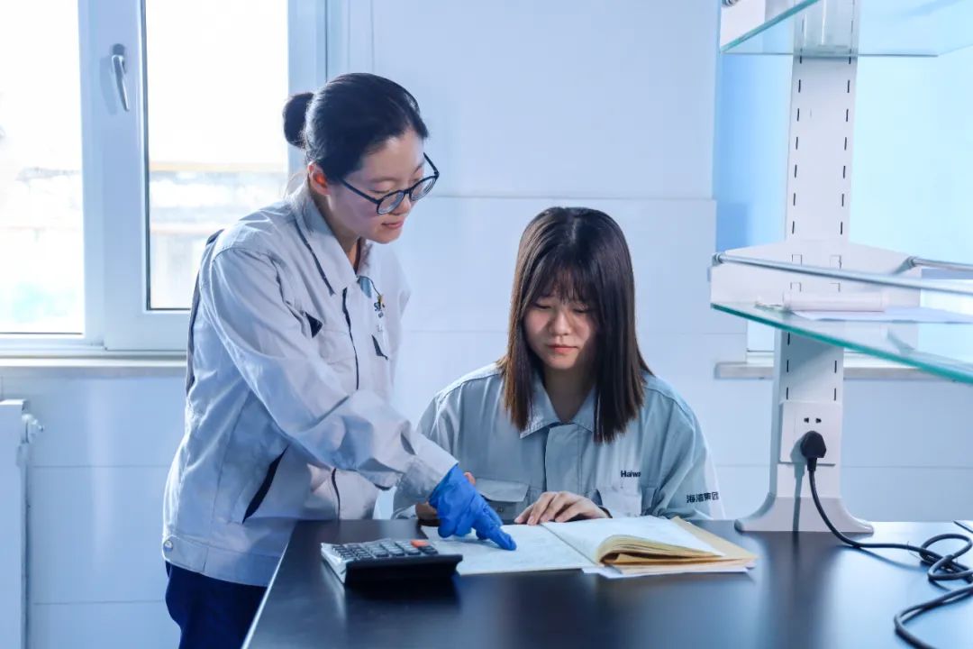 陳雙的其中一位徒弟張廷廷已成長(zhǎng)為堿業(yè)發(fā)展質(zhì)量監(jiān)督部高級(jí)主管,“我是中國(guó)石油大學(xué)畢業(yè)的碩士研究生,2021年進(jìn)廠,那時(shí)陳主管從怎么拿錐形瓶、怎么使用滴定管等基礎(chǔ)的操作手法一點(diǎn)一點(diǎn)教給我。”張廷廷回憶起與陳雙的相處的細(xì)節(jié)時(shí)說(shuō),在陳雙教給她檢測(cè)技術(shù)和手法的同時(shí),她們也共同探討如何改進(jìn)檢測(cè)技術(shù)。“在做COD(化學(xué)需氧量)測(cè)定時(shí),陳主管教給我的是將試管搖勻后直接測(cè)定,隨著物體沉降,數(shù)據(jù)一直不斷變化,就導(dǎo)致了得出的數(shù)值并不穩(wěn)定。我向陳主管提出這一問(wèn)題,后來(lái)我們查閱文獻(xiàn),決定將試管搖勻后靜置一段時(shí)間,再進(jìn)行測(cè)量。”